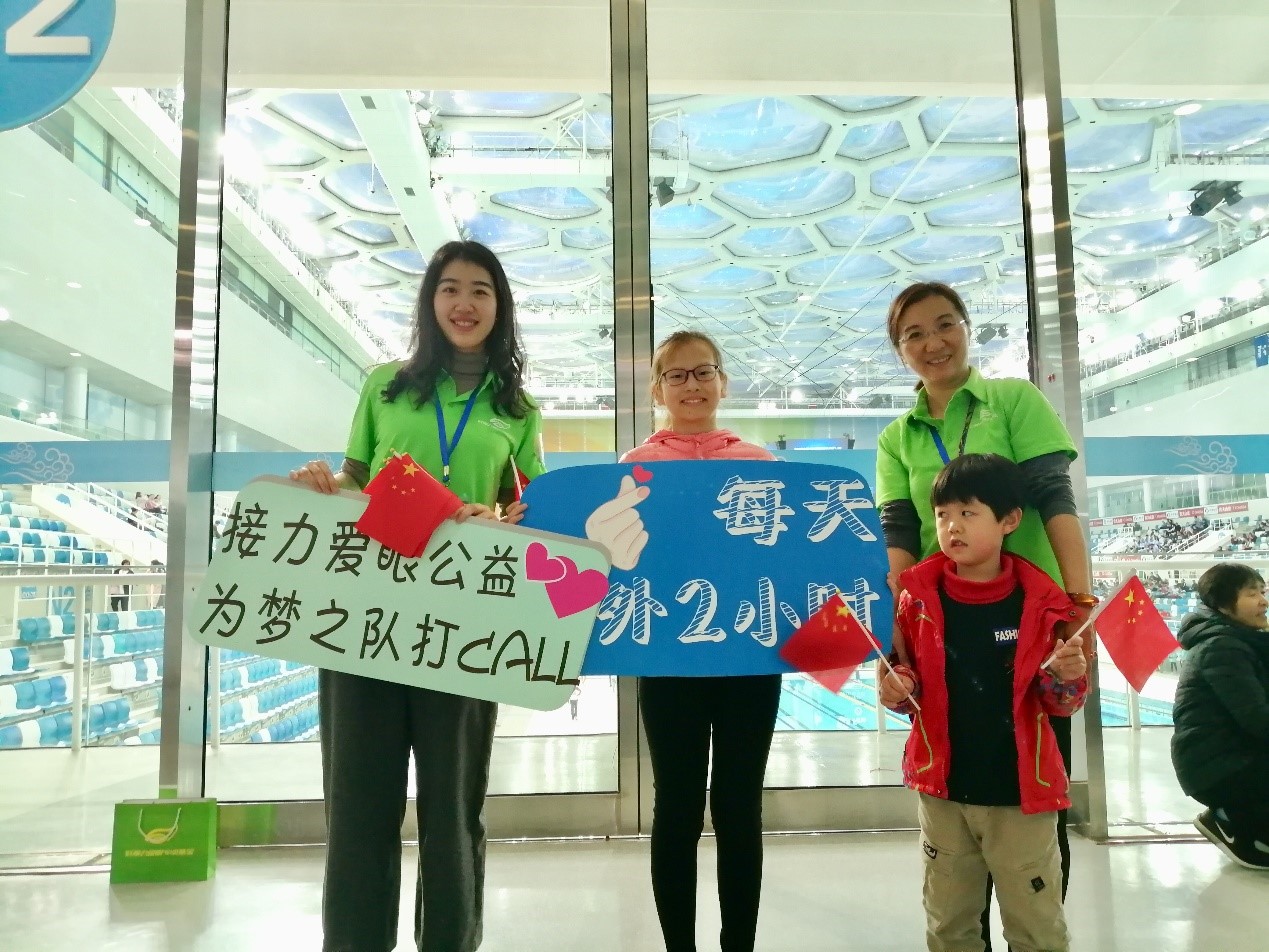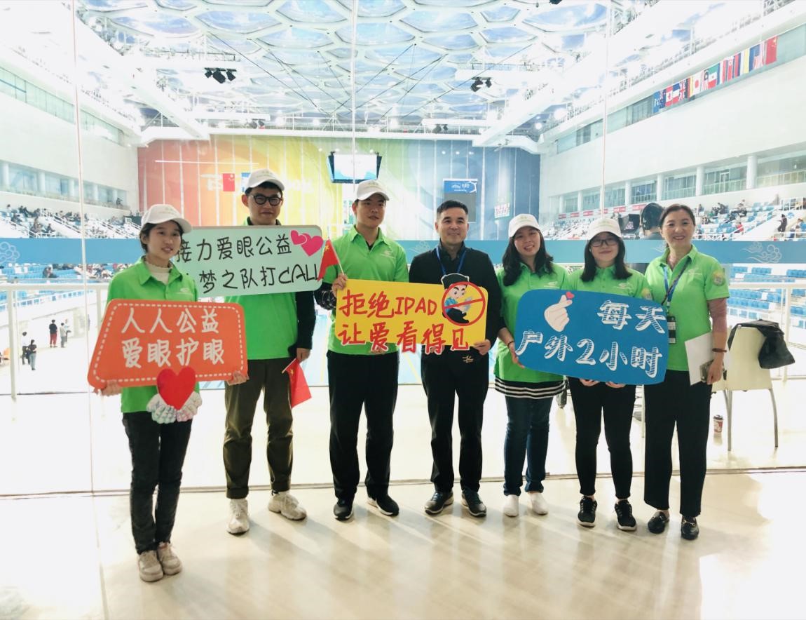 好視力愛眼專項基金執(zhí)行主任楊主任(中)在水立方與志愿者們共同倡導(dǎo)公益眼健康