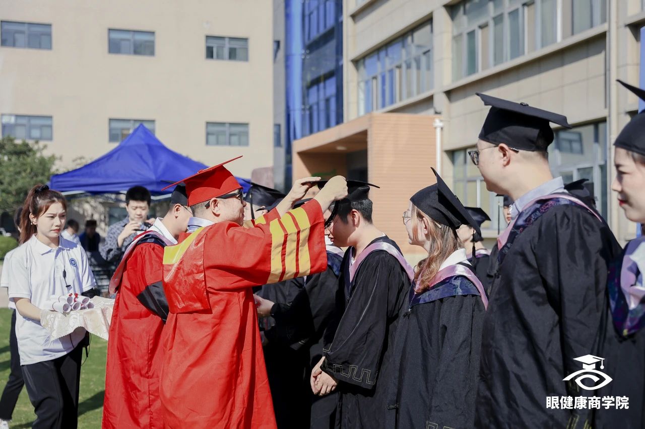 畢業(yè)撥穗儀式開始后,眼健康商學(xué)院三期學(xué)員登臺(tái)站定,由眼健康商學(xué)院院長楊建軍、執(zhí)行院長張?jiān)迄i為他們撥穗正冠、頒發(fā)畢業(yè)證書。