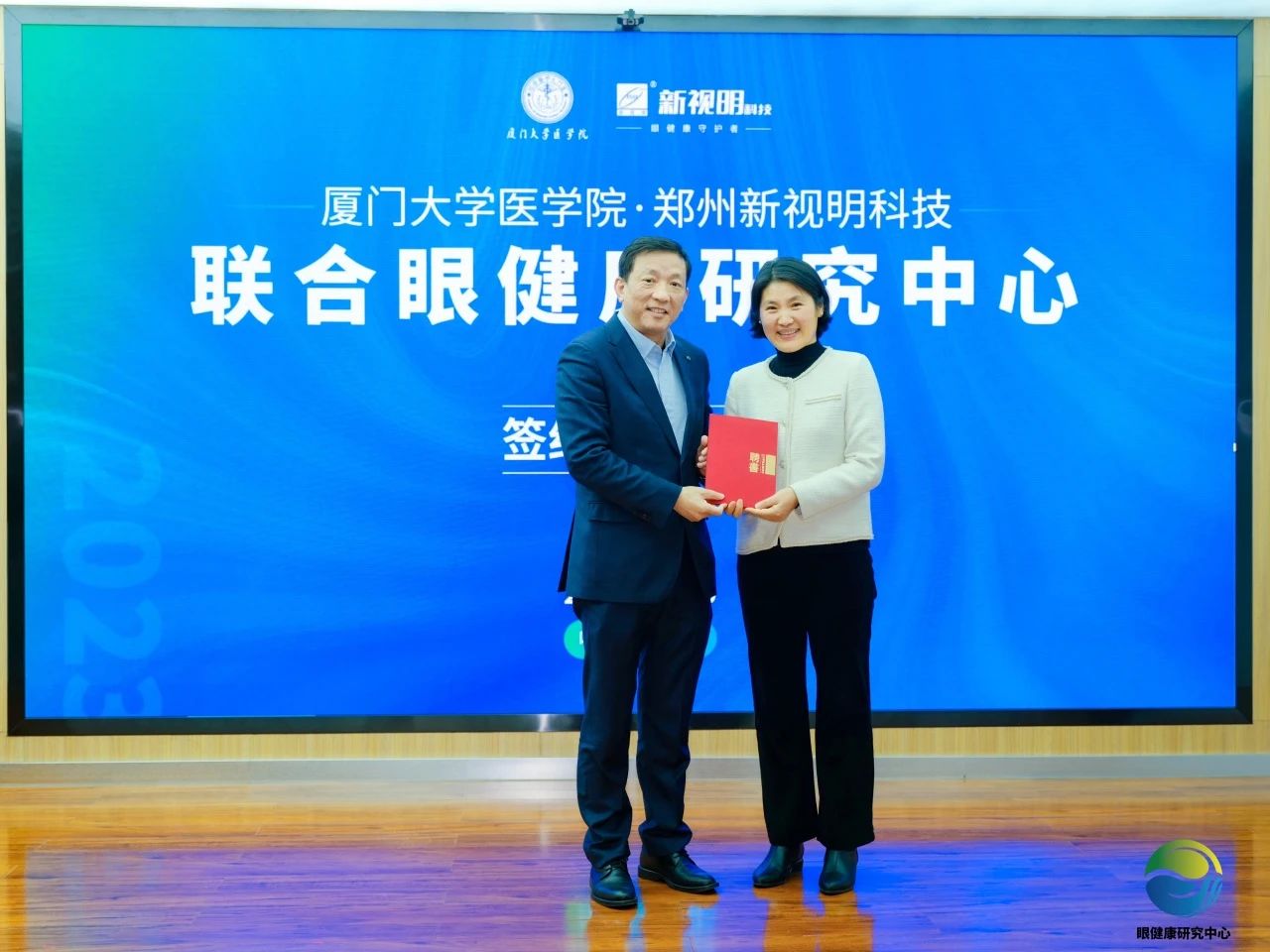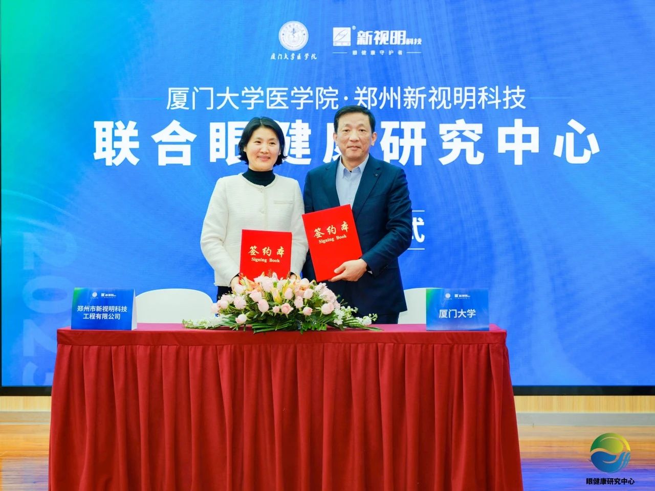 在各方代表和嘉賓的共同見證下,廈門大學(xué)眼科研究所所長劉祖國、鄭州新視明科技總經(jīng)理張秋霞,共同簽署了合作協(xié)議。