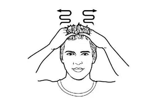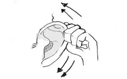 2、抱頭按壓:雙手指尖朝上,無名指壓在眉頭內(nèi)側(cè)(即攢竹穴,拇指壓在頸項與發(fā)際的交接凹處(即風(fēng)池穴),十指自然張開呈抱頭狀,掌心貼近耳朵。稍用力按壓并往上推。